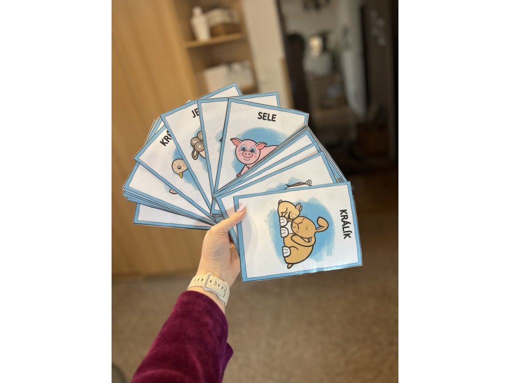 •Rytmizace – do řady vyskládejte 6 kartiček (pes, kočka atd..). Vždy si řadu řekněte a postupně zvířata odebírejte, až nezbydou žádná. Zkuste říct to, jak šla za sebou i bez karet. Cílem je procvičení paměti.